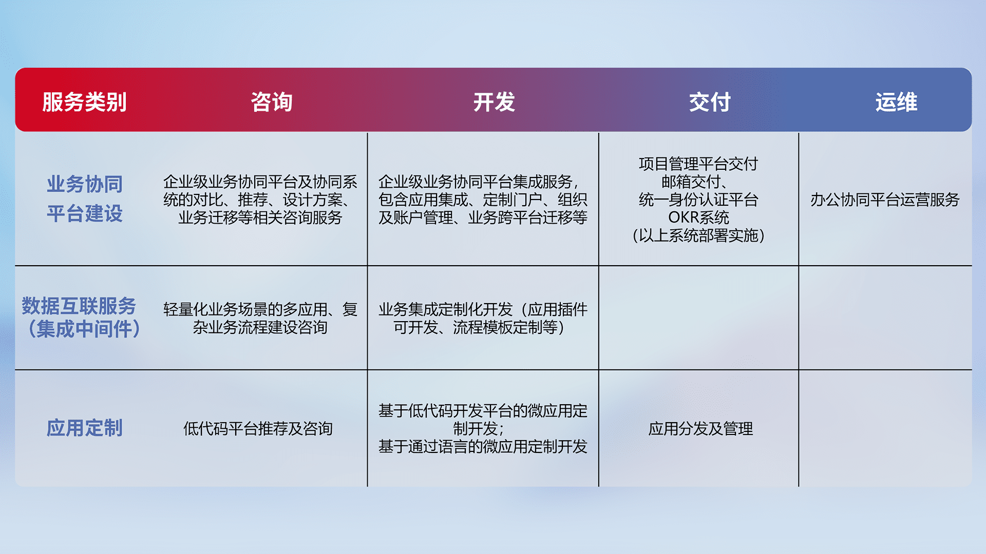 针对钉钉、、、企微、、、IDaas等平台级产品提供产品的规划、、方案、、交付、、、定制化开发等服务,,,实现如统一协同办公、、、智能客户服务、、、混合会议管理、、智能数据查询、、、等业务场景,,实现数字化转型。。。